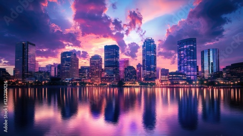 © Rodica, Fototapeta premium Vibrant cityscape at dusk with colorful clouds and reflections