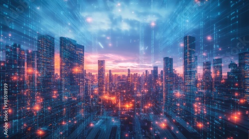 © Damerfie, Fototapeta premium Vibrant Cityscape at Dusk with Digital Overlay