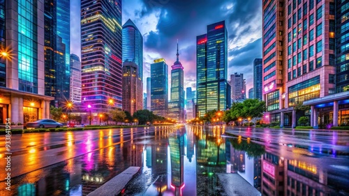 Obraz premium Vibrant cityscape at dusk with sleek skyscrapers, bustling streets, and colorful neon lights reflecting off wet pavement, casting a magical urban ambiance.