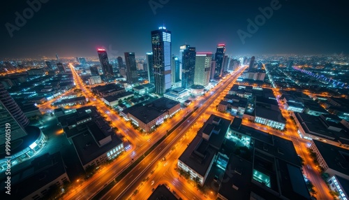 © SwathiFX, Fototapeta premium Vibrant cityscape at night illuminated by bright lights