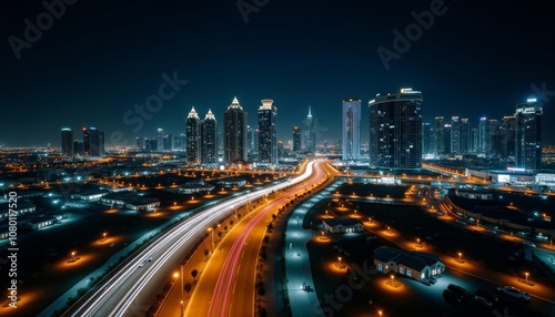 © SwathiFX, Obraz premium Vibrant cityscape at night illuminated by bright lights and bustling traffic