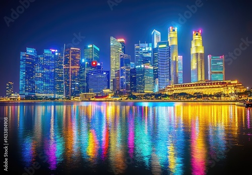 © fauzi, Fototapeta premium Vibrant cityscape at night, reflected in calm water