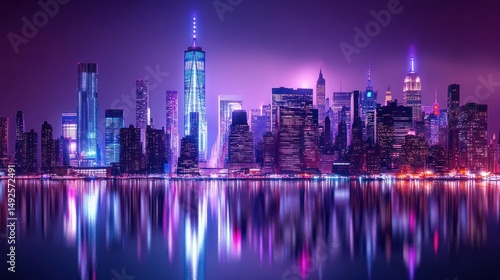 © Rizky, Fototapeta premium Vibrant cityscape at night, reflected in calm water (1)