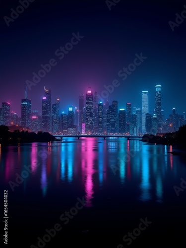 © Puchong, Fototapeta premium Vibrant cityscape at night, reflected in calm water. Neon lights illuminate modern skyscrapers, creating a stunning, futuristic scene.