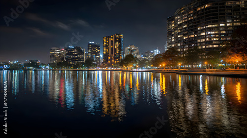 © AN STOCK, Naklejka premium Vibrant cityscape at night reflecting lights on calm water