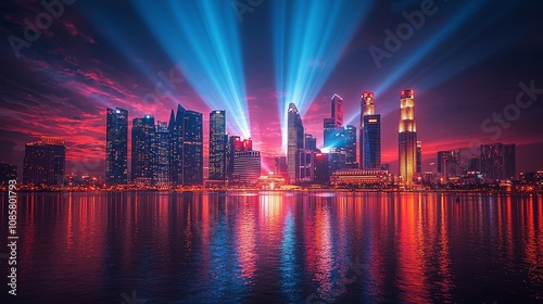 Fototapeta premium Vibrant cityscape at night with colorful lights and reflections on water