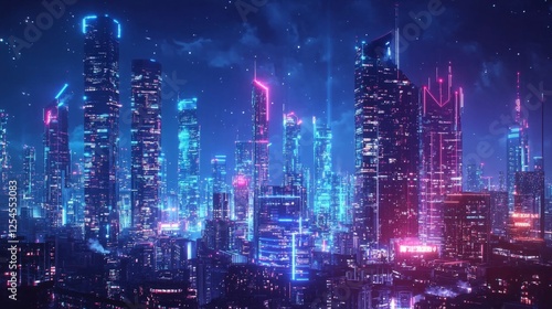 © Tuachan, Obraz premium Vibrant Cityscape at Night with Neon Lights and Futuristic Vibes