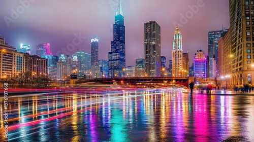 © Julius, Fototapeta premium Vibrant Cityscape at Night with Reflective Water and Illuminated Skyscrapers