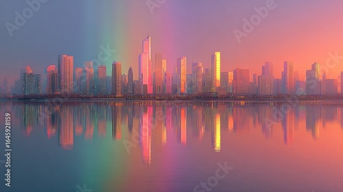 © Andrew, Fototapeta premium Vibrant cityscape at sunrise, reflected in calm water, with a pastel rainbow