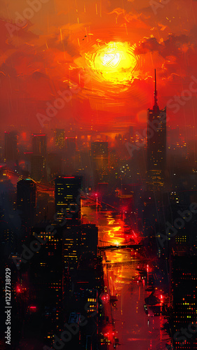 Fototapeta premium vibrant cityscape at sunset, illuminated by neon lights and reflections on water