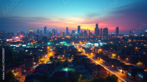 © orendesain99, Fototapeta premium Vibrant Cityscape at Sunset Skyline Glows