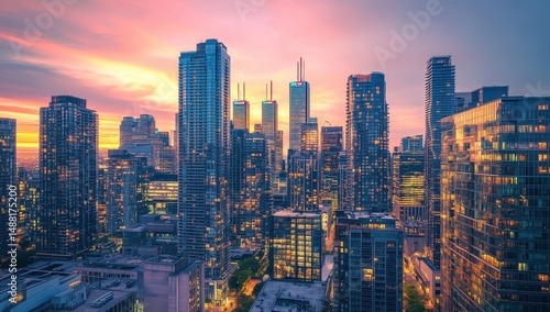 Fototapeta premium Vibrant cityscape at sunset, skyscrapers glow