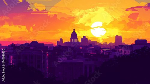 © Faziljan, Fototapeta premium Vibrant cityscape at sunset with stylized brushstrokes. A glowing sun sets behind a prominent dome building.