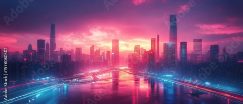 © zipop, Fototapeta premium Vibrant cityscape at twilight with neon lights.