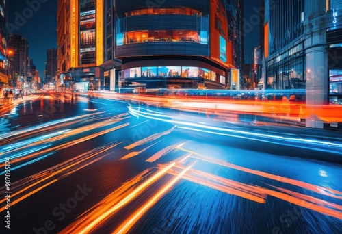 © Yaroslava, Fototapeta premium vibrant cityscape dynamic movement blur effects capturing urban energy life, architecture, skyline, buildings, streets, night, lights, atmosphere