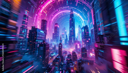 Naklejka premium vibrant cityscape featuring futuristic skyscrapers illuminated by neon...