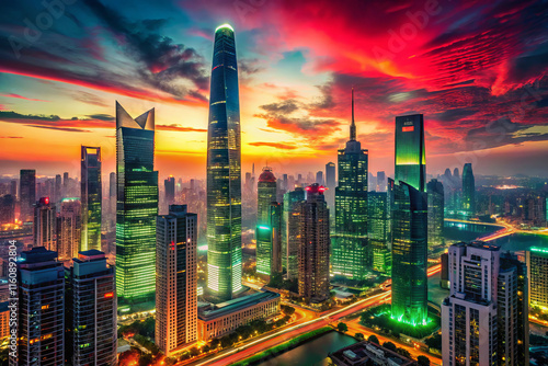 © sunflower24, Fototapeta premium vibrant cityscape featuring futuristic skyscrapers illuminated by sunset hues. skyline showcases modern architecture against dramatic sky, creating stunning urban scene