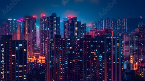 © Bussakon, Fototapeta premium Vibrant Cityscape Illuminated by Colorful Lights at Night