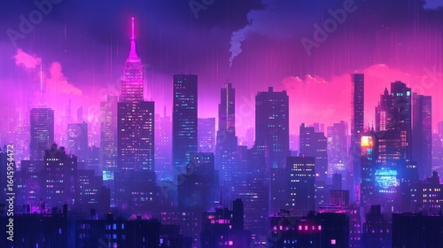 Obraz premium Vibrant cityscape illuminated with neon hues under a dreamy purple and pink...