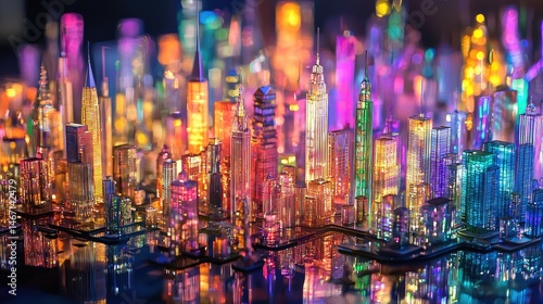 © Nuriya, Obraz premium Vibrant cityscape model, illuminated with colorful lights.