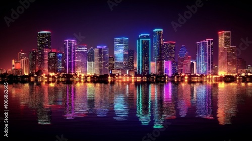 Naklejka premium Vibrant Cityscape: Neon-Lit Skyscrapers Reflected in the Water