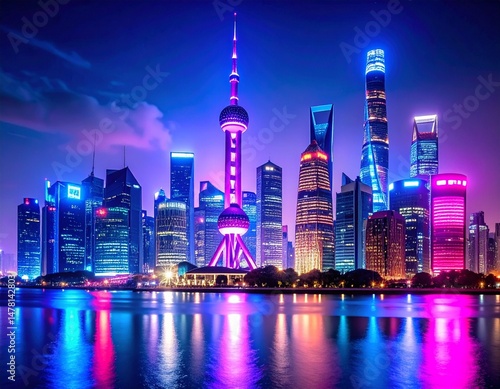 Fototapeta premium vibrant cityscape night skyline modern urban architecture building pink blue neon glow view water