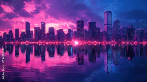 © Almahyra, Fototapeta premium Vibrant cityscape reflected in calm water at sunset.