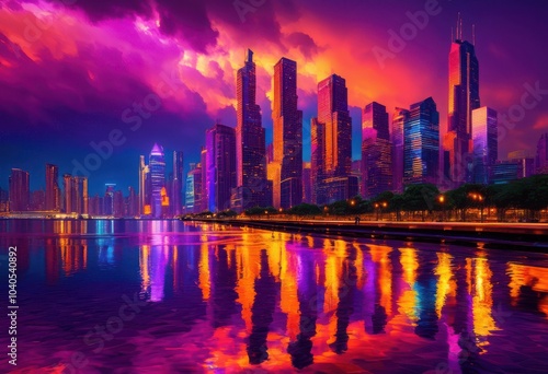 © Yaroslava, Fototapeta premium vibrant cityscape reflections wet pavement dusk captured stunning vivid colors highlighting skyscrapers street lights, skyline, urban, buildings, architecture