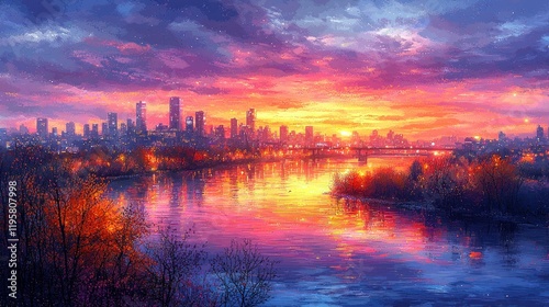 Fototapeta premium Vibrant Cityscape Sunset Reflection