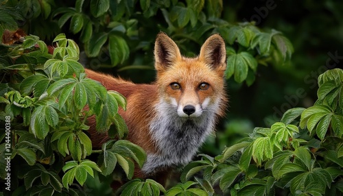 Naklejka premium Vibrant Cityscape Transformed by a Mysterious Urban Red Foxs Entrance from Lush Vegetation, Amidst the Deep Green Canopy of the Concrete Jungle