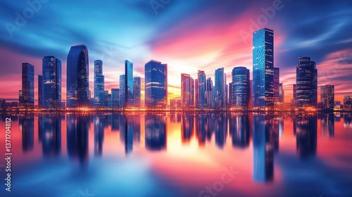 © Hijrah, Fototapeta premium Vibrant cityscape with a stunning skyline reflected in calm water.