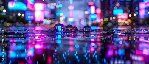 Obraz premium Vibrant Cityscape with Colorful Neon Lights and Raindrops on Wet Surface in...