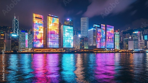 © siyons, Fototapeta premium Vibrant cityscape with illuminated skyscrapers reflecting in the water at night.