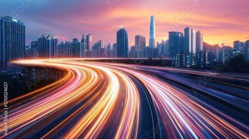 Fototapeta premium Vibrant Cityscape with Illuminating Highways at Colorful Sunset in Bustling...