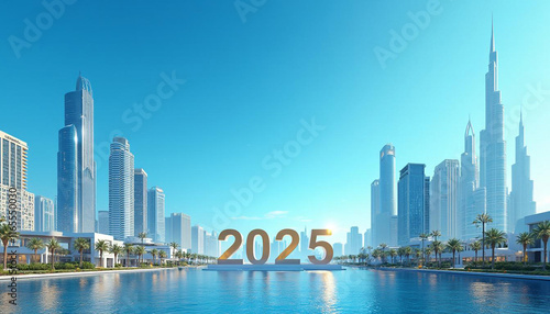 © Ahmed, Obraz premium Vibrant Cityscape with "2025" Neon Sign