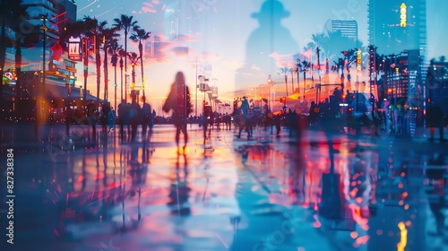 Obraz premium Vibrant cityscape with palm trees and silhouettes at sunset reflecting on wet...
