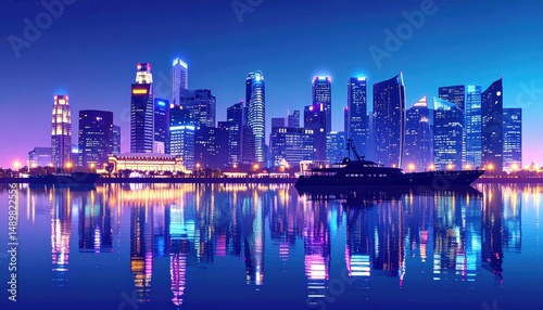 © Kitta Studio, Fototapeta premium Vibrant Cityscape with Water Reflections in Harbor at Night
