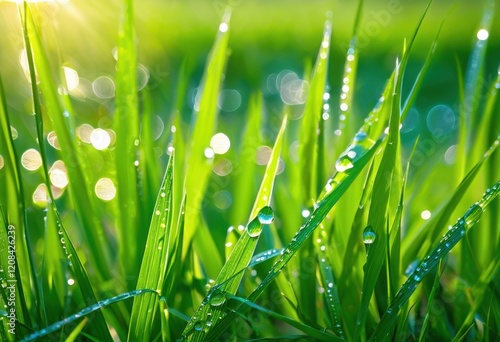 © Yaroslava, Fototapeta premium vibrant close dew kissed green grass showcasing morning sparkle freshness radiant details, dewdrop, leaf, nature, plant, closeup, macro, garden, spring