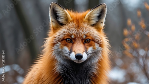 © GenZGraphics, Obraz premium Vibrant close-up of a red fox showcasing its striking orange fur and inquisitive expression in a natural forest setting.