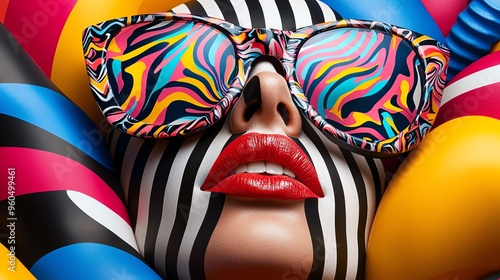 Naklejka premium Vibrant close-up of a woman with colorful sunglasses against bold striped...