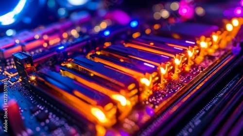 © Makarim, Fototapeta premium Vibrant Close-Up of Illuminated Computer RAM Slots