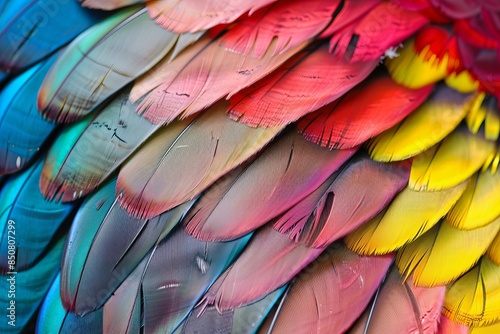 © anatolir, Obraz premium Vibrant closeup of multicolored parrot feathers showcasing intricate textures