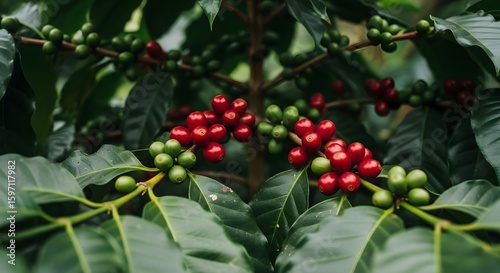 © FPH Lab, Obraz premium Vibrant Coffee Cherries Ripening on Lush Green Plant