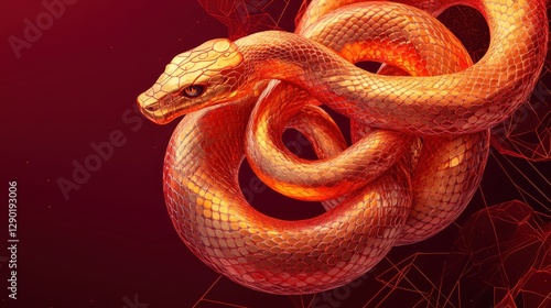 © Songsak, Fototapeta premium Vibrant Coiled Golden Snake on Abstract Red Background with Geometric Patterns and Textures