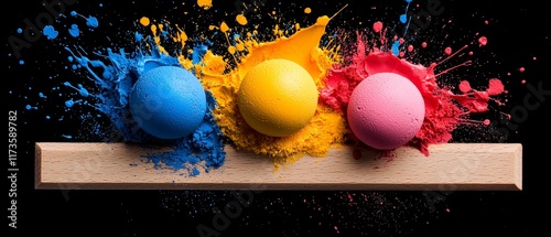 Fototapeta premium Vibrant Color Explosion Three Spheres Impacting Wood Cyan Magenta Yellow Paint Splashes