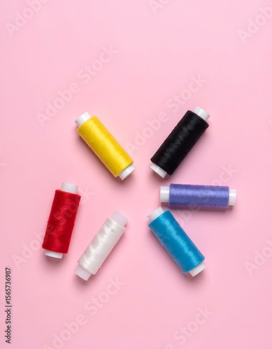Naklejka premium Vibrant colored sewing thread spools neatly arranged on a bright pink...
