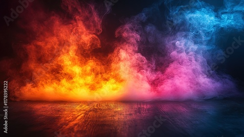 © andryan, Naklejka premium Vibrant Colored Smoke Above Dark Wooden Surface