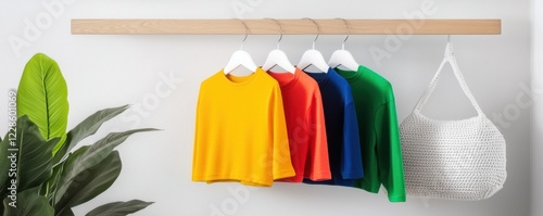 © Onzdemia, Naklejka premium Vibrant colored tops hung neatly on a wooden display.