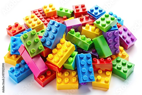 Obraz premium Vibrant colorful building blocks scattered on a white background, featuring...