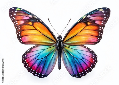 © Adisorn, Fototapeta premium Vibrant Colorful Butterfly on Pure White Background - Minimalist Stock Photo